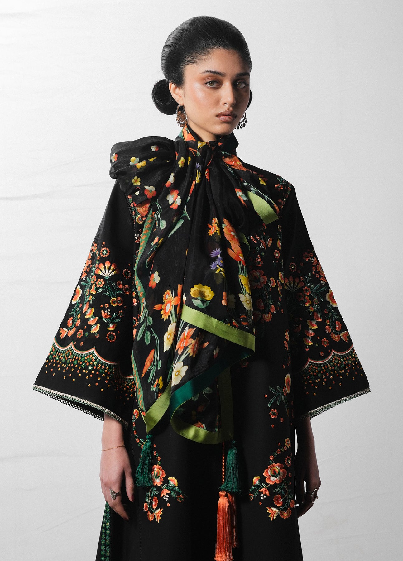 A long black shirt adorned with multicolor floral embroidery and subtle sequins is complemented by matching bell sleeves for a refined, graceful silhouette. It is styled with black dyed culottes featuring an embroidered border, while a digital printed silk dupatta adds a contemporary and elegant finish.