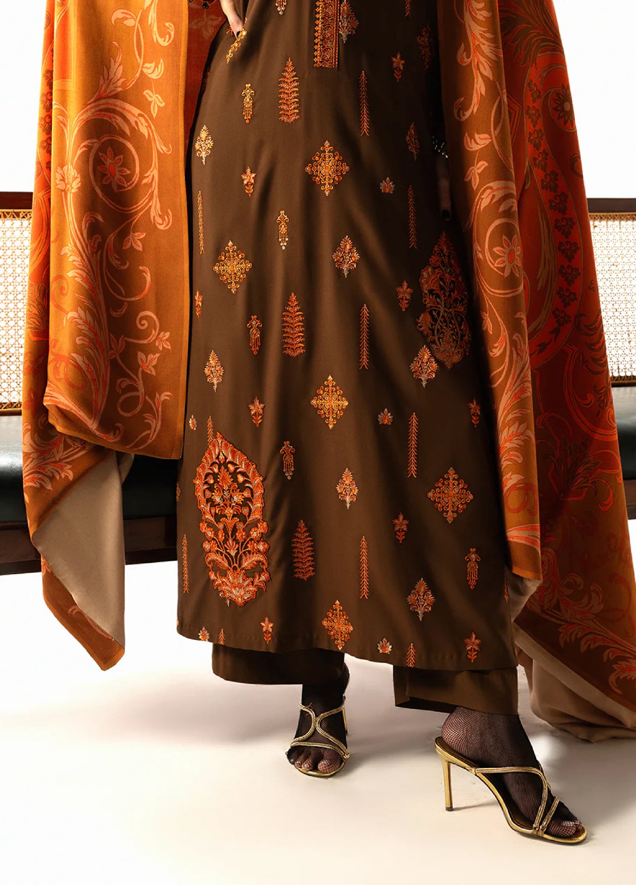 Rovi is an ode to the earth's timeless beauty, crafted in rich, grounding tones. The deep, warm brown Marina Twill suit provides a sophisticated canvas, subtly adorned with delicate tribal-inspired embroidery on the sleeves. This subdued elegance is dramatically elevated by the exquisite Lenzing Ecovero shawl, which blooms with an intricate tapestry of patterns in vibrant oranges, deep rusts, and warm terracotta. The shawl drapes with an inviting warmth, creating a harmonious blend of understated luxury and bold artistic expression.