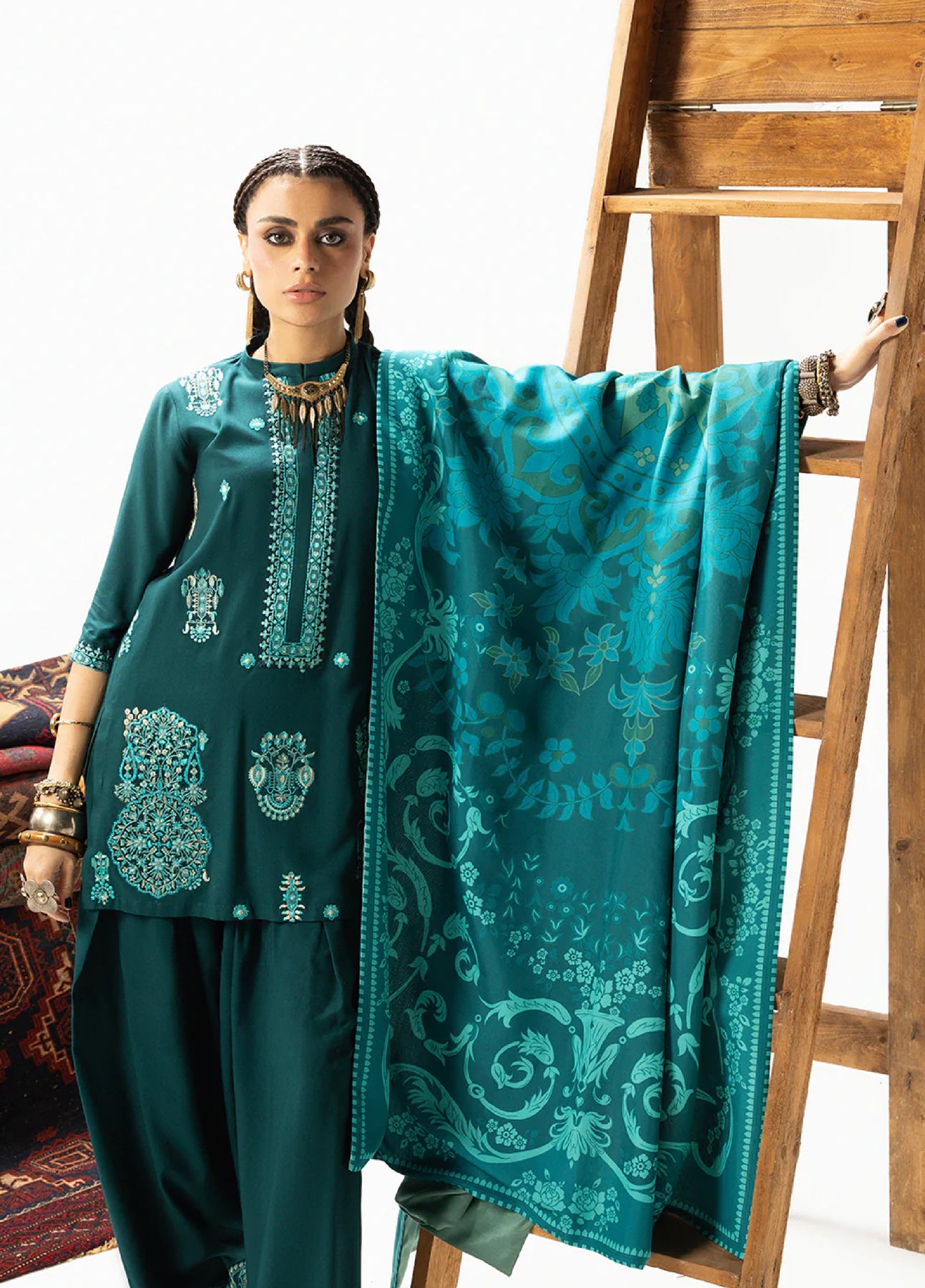 Kyana is a statement of unparalleled depth and luxury, captured entirely in the most mesmerizing jewel tones. The flowing Marina Twill ensemble is drenched in a profound emerald green, providing the ideal backdrop for intricate, tonal embroidery in teal and lighter jade hues. The complex motifs cascade across the suit and onto the matching Lenzing Ecovero shawl, creating a seamless, ethereal silhouette that trails elegantly. This monochromatic masterpiece emphasizes artisanal craftsmanship and regal grace.