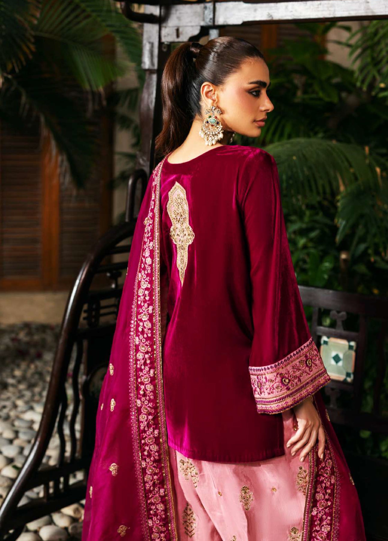 A festive unstitched outfit featuring a rich Maroon Velvet shirt with heavy traditional Zardozi and thread work concentrating on the neckline and borders. It is beautifully contrasted with a Blush Pink Raw Silk Shalwar adorned with scattered motifs. The look is completed with a graceful Maroon Organza Dupatta featuring a heavily embroidered border.