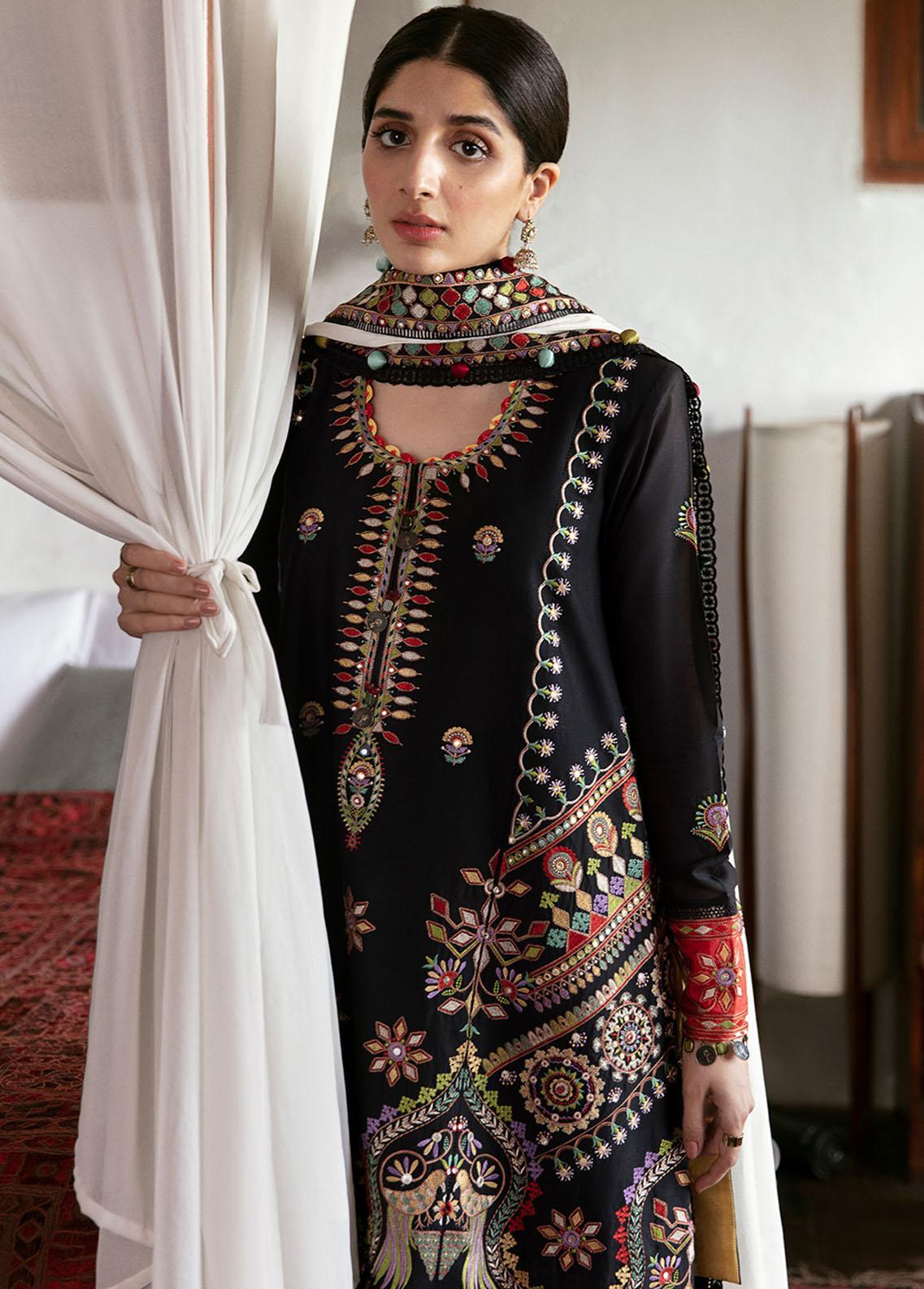 A sumptuous obsidian canvas, Naahid is layered with meticulous Tatami stitches in jeweled multi-hues to form an exquisite tribal tapestry. Adorned with indigenous flora and geometric elements in tessellated patterns, the shirt is paired with a celestial pearl hued dupatta layered with embroidered floral motifs that are framed with multi hued tukri borders. This elegant design is a stylish statement serving effortless bohemian glamour for the spirited Zaha woman