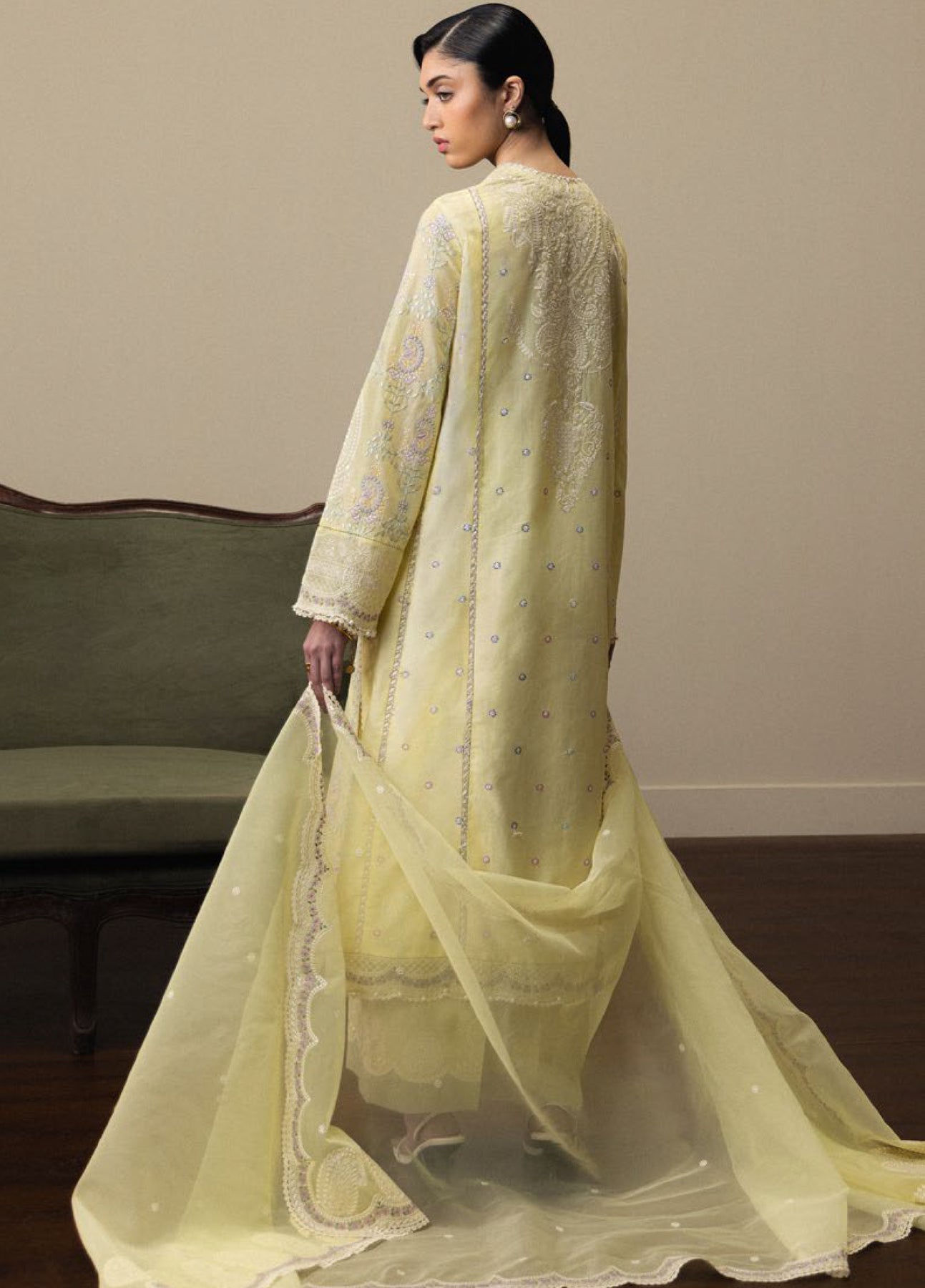 Hinata is crafted in luminous sunlight yellow, detailed with delicate chikankari embroidery across the shirt and dupatta for a graceful, radiant silhouette. Complemented with matching embroidered cambric trousers and layered organza borders, the ensemble embodies timeless sophistication and heritage-rooted charm.