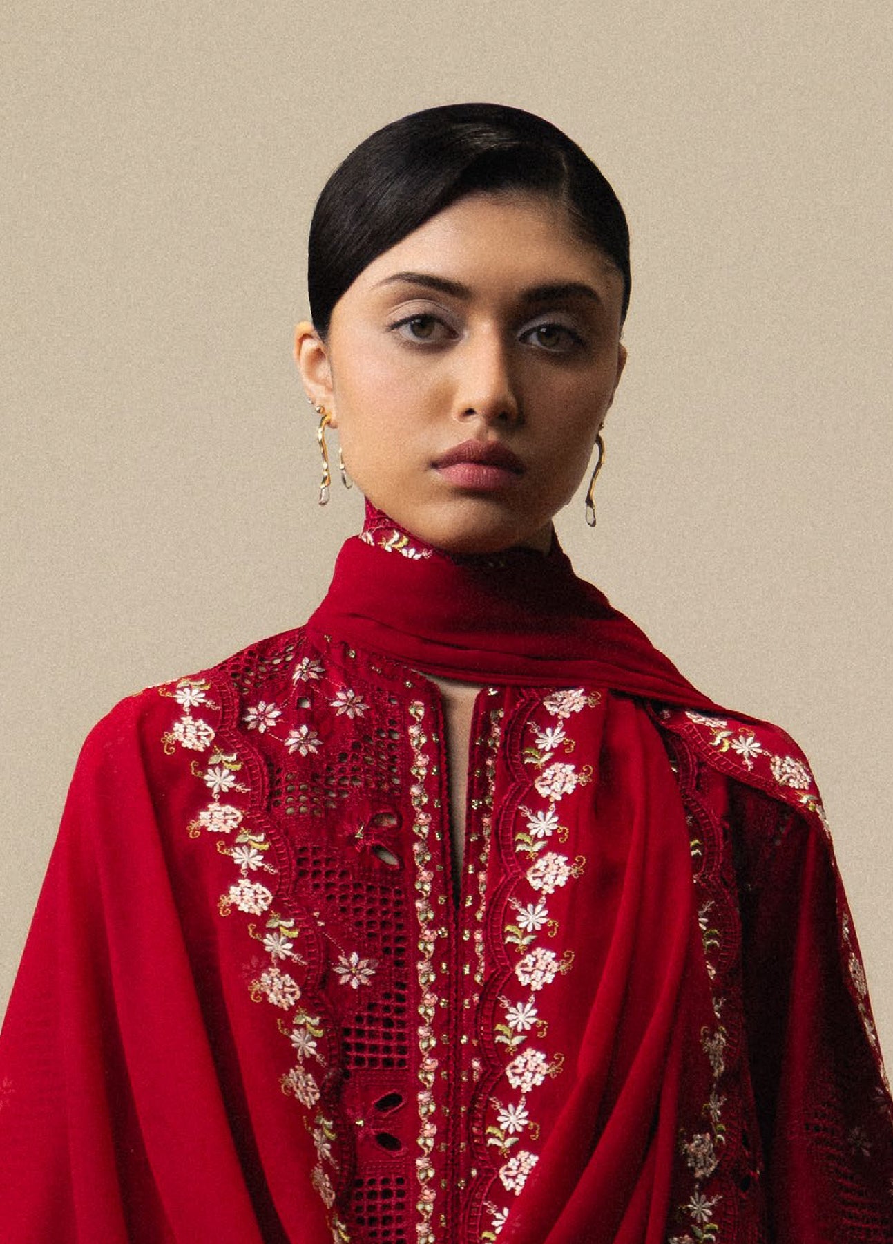 Akari is crafted in striking red with delicate jaali-inspired embroidery, paired with a coordinating embroidered dupatta and finely detailed cambric trousers. Accented with organza borders and embroidered panels, the ensemble exudes heritage-rooted elegance and timeless sophistication.