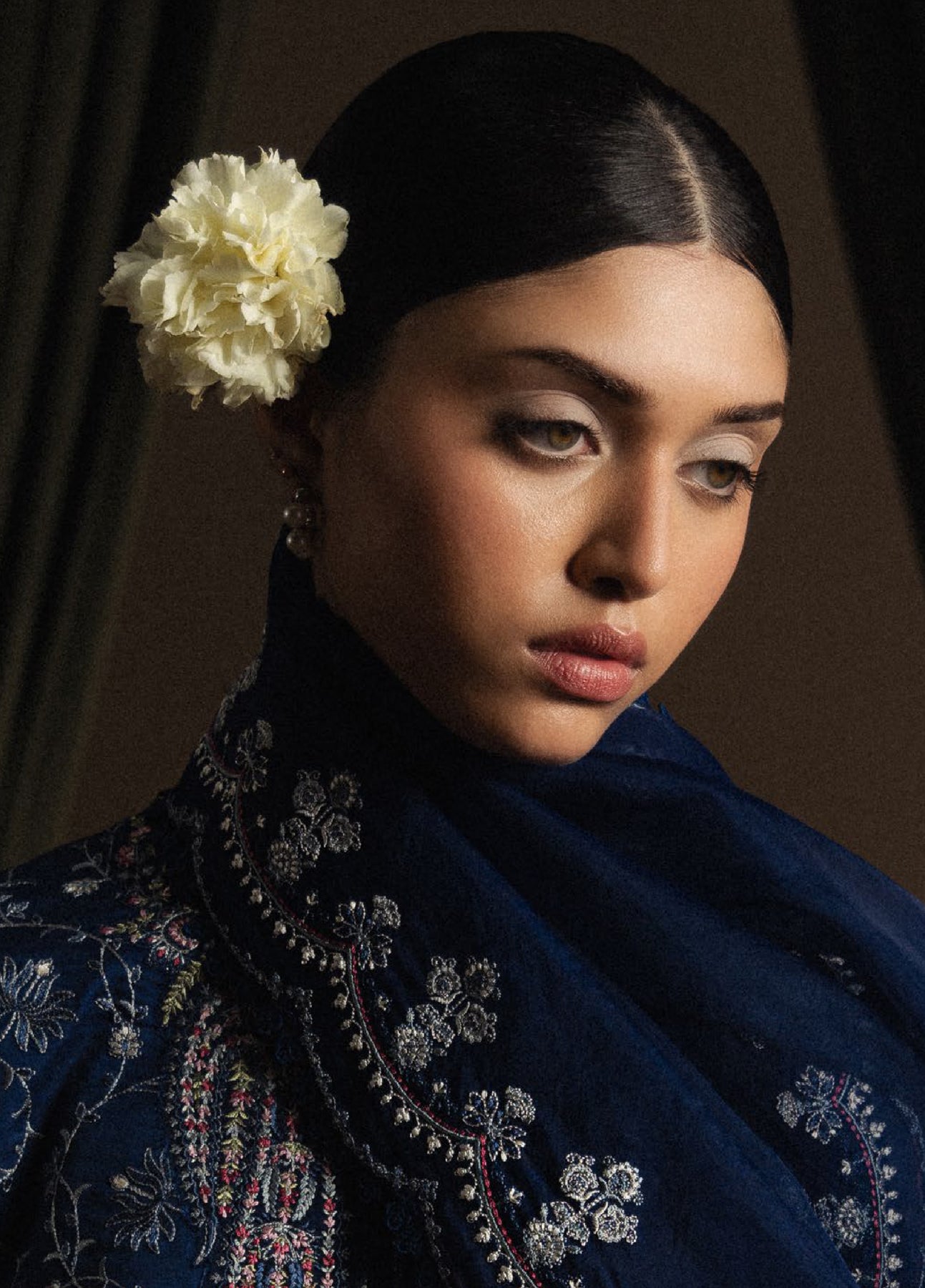 Suiyo is crafted in deep blue with delicate Kashmiri chikankari embroidery, paired with a coordinating embroidered dupatta and matching cambric trousers. Accented with organza borders and detailed embroidered panels, the ensemble exudes heritage-rooted sophistication and understated elegance.