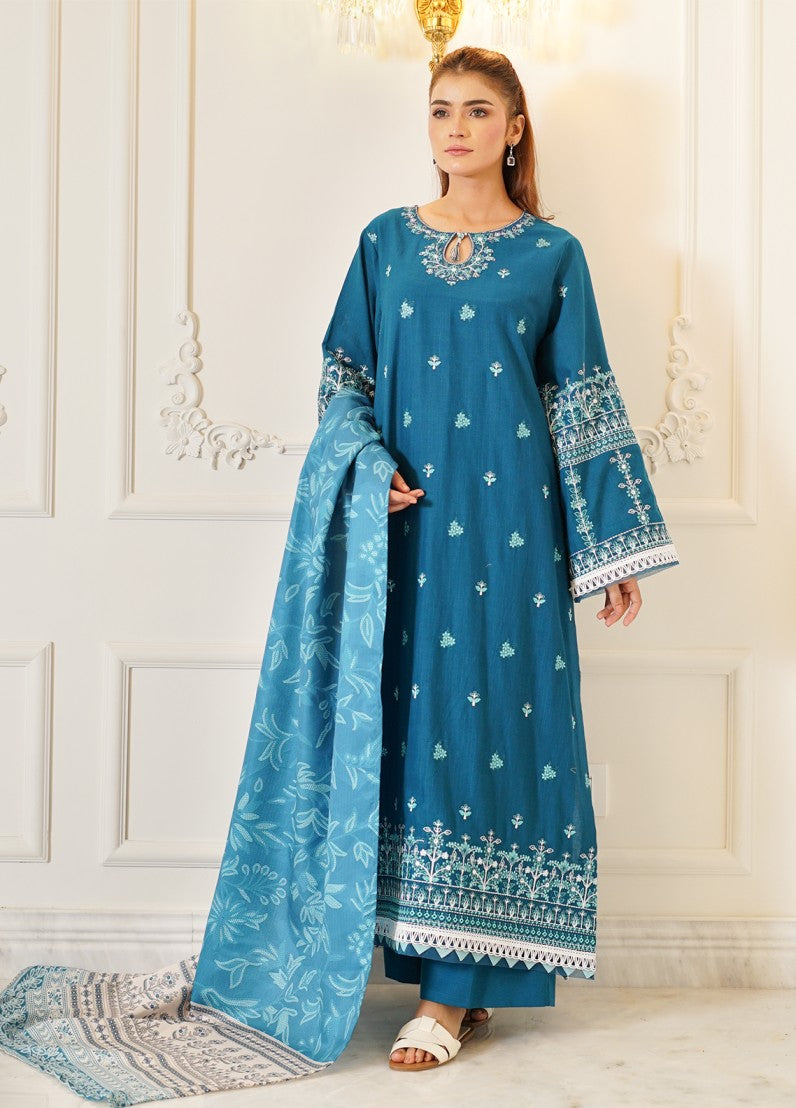 A refined winter look in a striking teal base, this khaddar outfit is tastefully adorned with embroidery in soft off-white and tonal teal shades. The shirt features an elegantly embroidered neckline that draws the eye, while borders and sleeves are accentuated with intricate floral detailing. Clean lines and graceful motifs give this ensemble a fresh yet traditional appeal. Paired with plain khaddar trousers and a complementing wool shawl, this outfit balances cozy warmth with sophisticated style, making it a versatile choice for seasonal gatherings.