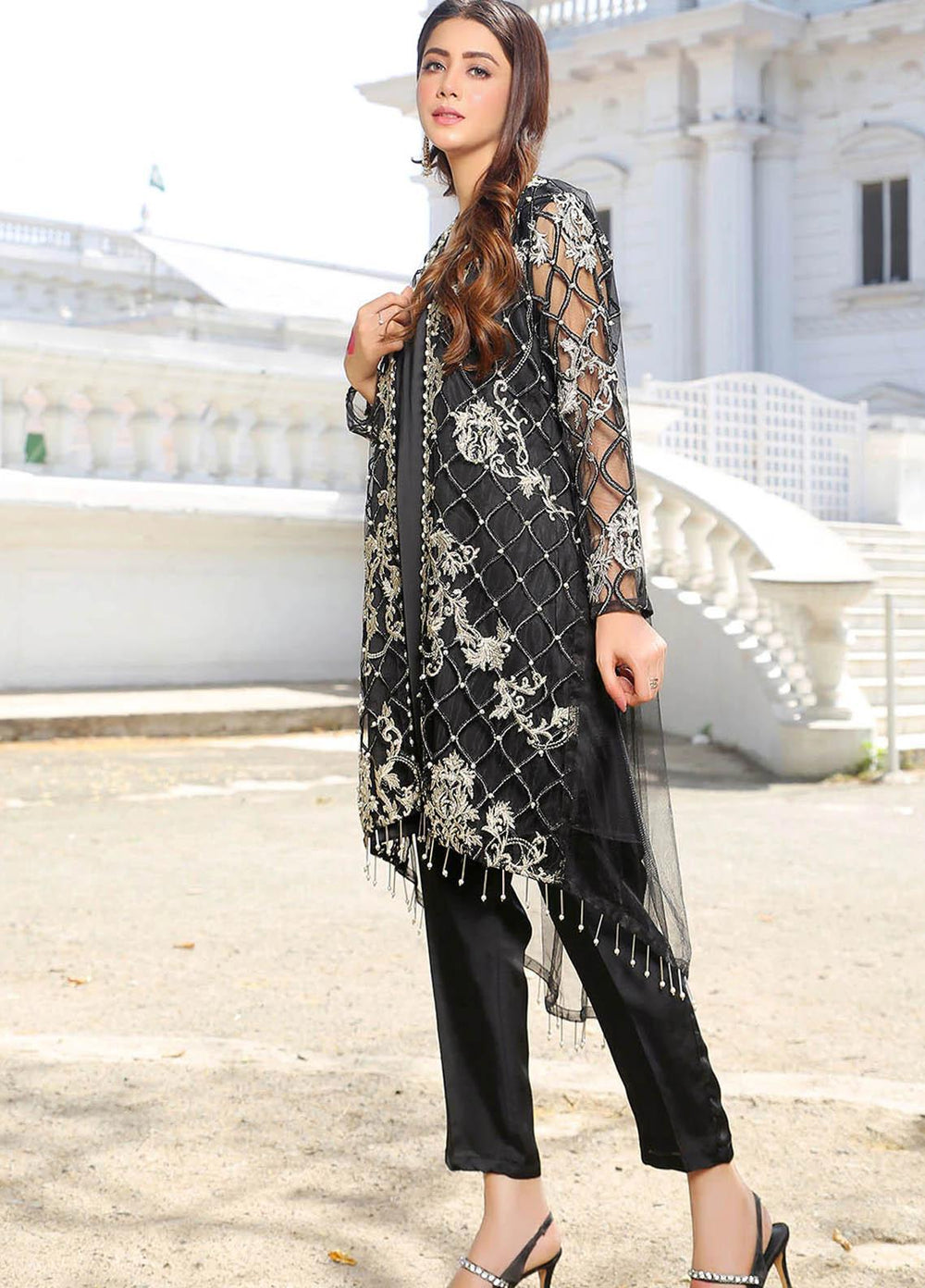 Gown: Embroiderednet gown embellished with pearls and stones on front and sleeves. This gown is beautified by adding tassels on daman. Shirt: Silk inner. Trouser: Silk straight pant.
