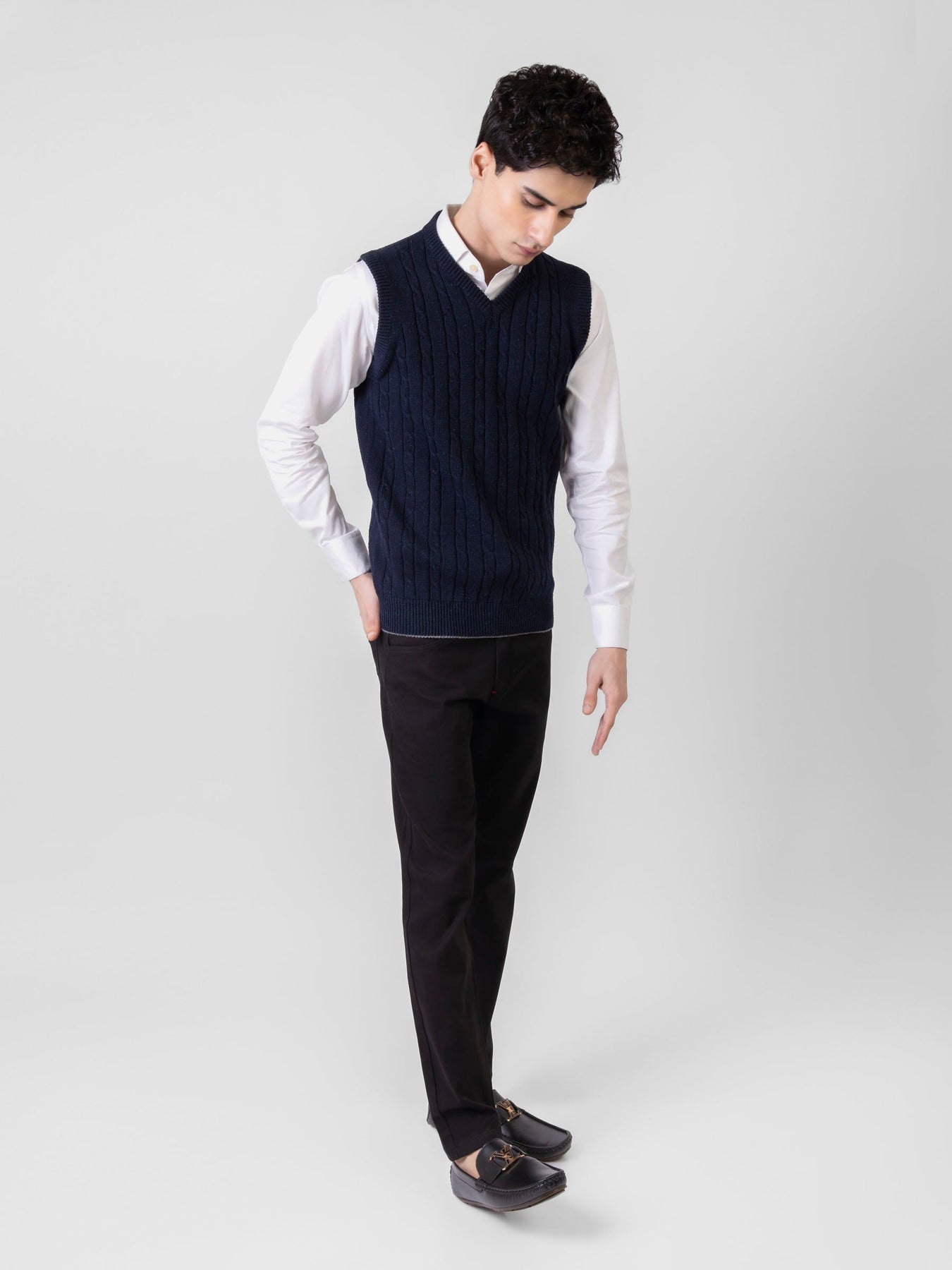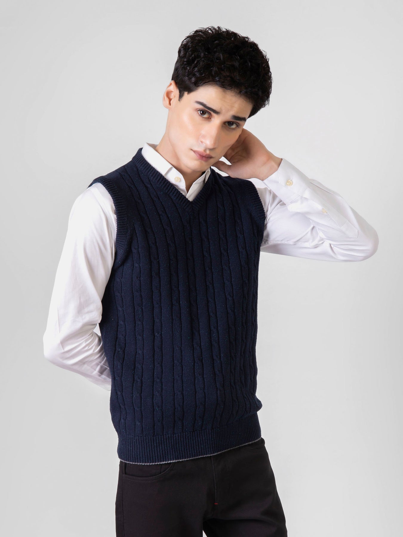 Everyday classic sleeveless v-neck sweater with cable knitted design a great layering piece. Featuring cable knit pattern, this comfortable v-neck sleeveless sweater is ideal for office. Featuring neppy yarn for a modern look