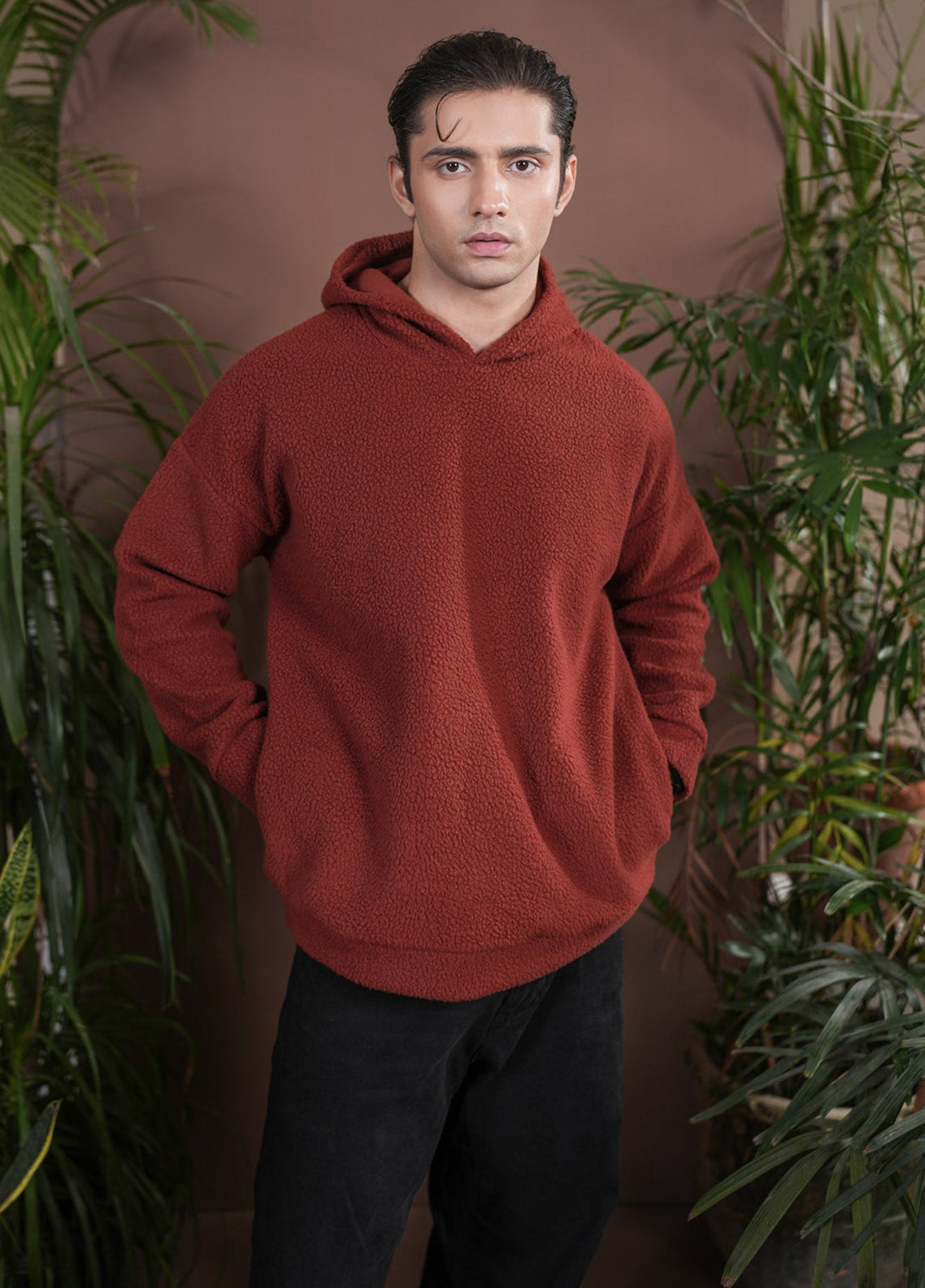 Hooded Sweatshirt In Plush Sherpa Fabric. Rust Tone Adds Warmth And Style With A Soft, Cozy Feel Perfect For Winter Days.
