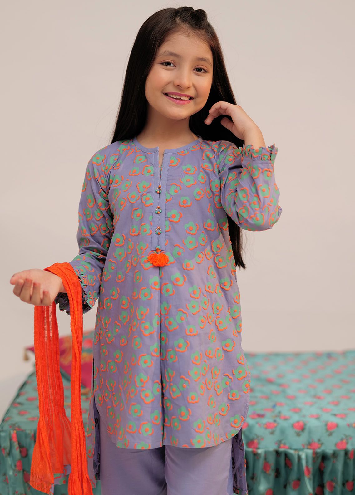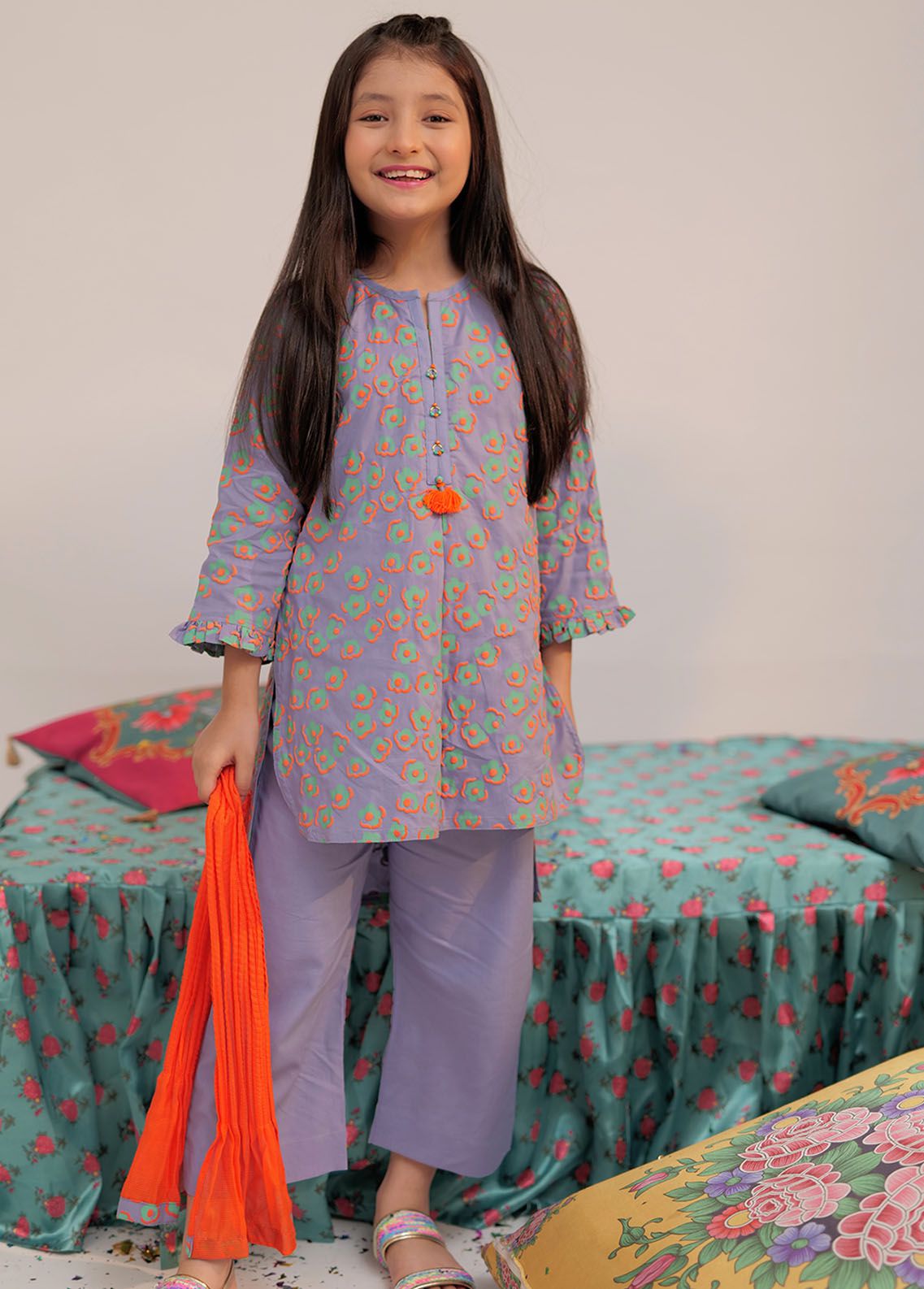 Kurta style high low shirt with round chalk daaman corners and central pleat in front and back having straight sleeves with frills on edges Embellished with beads and tassel on the neckline placket Paired with straight pants and solid colored contrasting chunri dupatta br data mce fragment 1