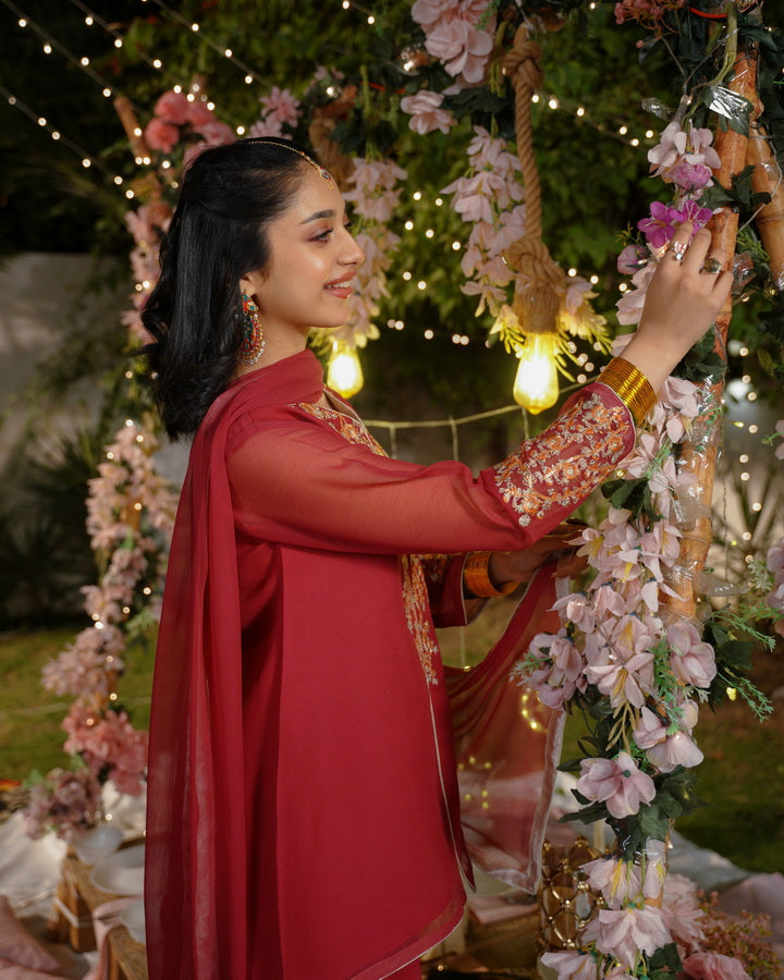 A deep magenta peplum-style shirt with intricate gold embroidery on the bodice and sleeves. Paired with flared trousers and a matching dupatta, it’s a bold and regal choice for festive evenings.