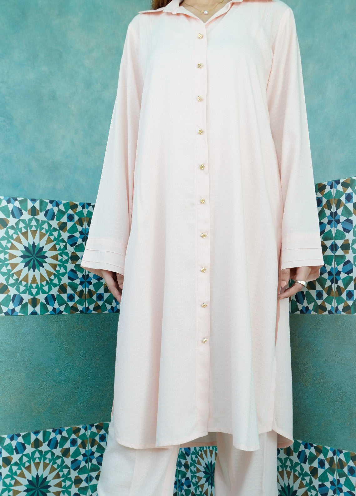Soft powder pink with a hint of shine. This elegant long shirt and straight-pant set is elevated with statement golden button embellishments that instantly stand out. Designed for graceful everyday wear, itβs polished, comfortable, and perfect for workdays when you want subtle glamour without overdoing it. Fabric: Linen