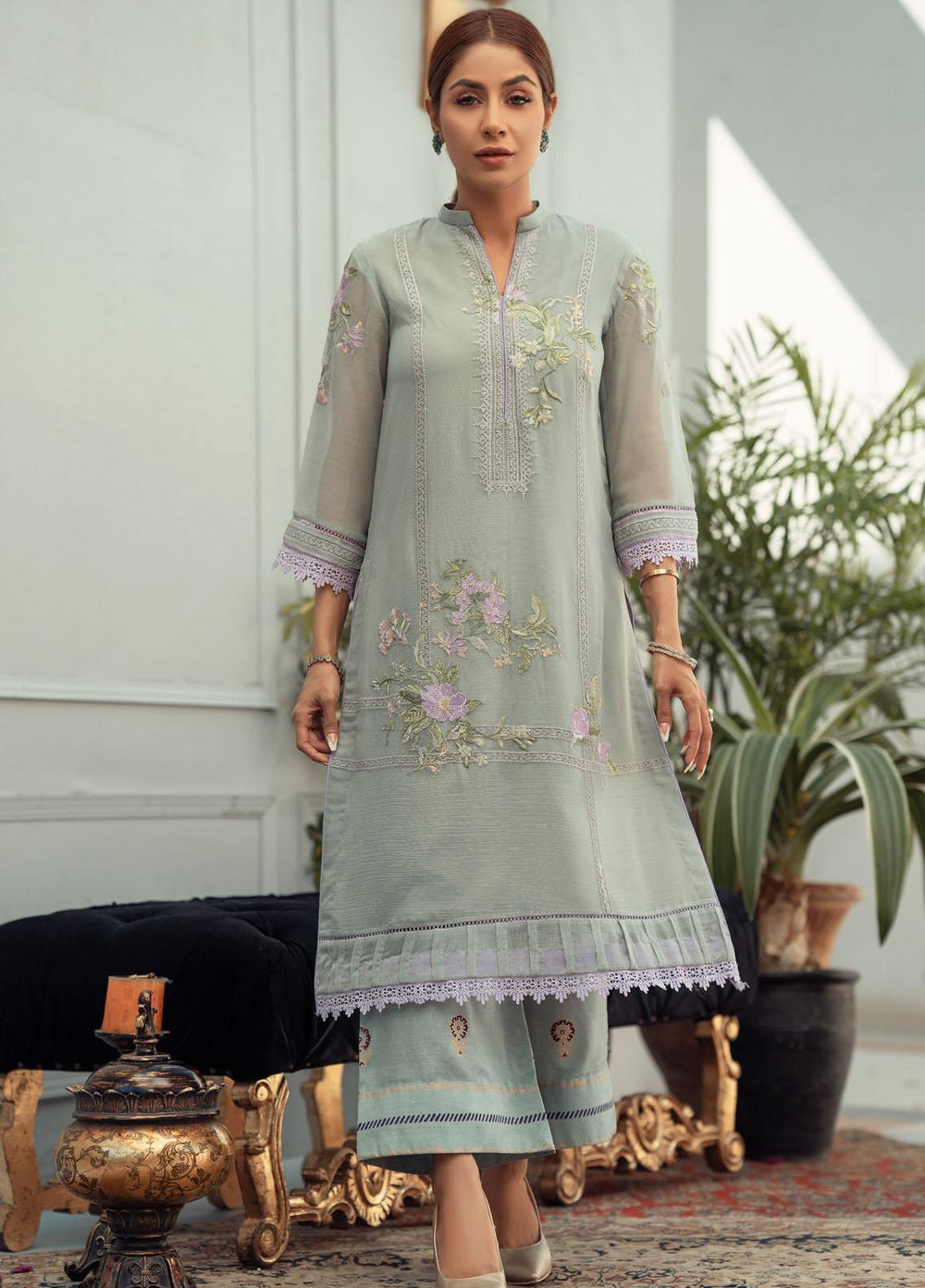 Muscari - another beauty piece coming in dark blue pastel hues. This one is an embroidered piece of art, especially those embellished pearl buttons on the neckline beautifying the delicacy of that fine piece of artistic ensemble. Its a 3 piece suit with an embroidered chiffon shirt front, block print back and sleeves paired with embroidered organza dupatta and a dyed raw silk trouser.