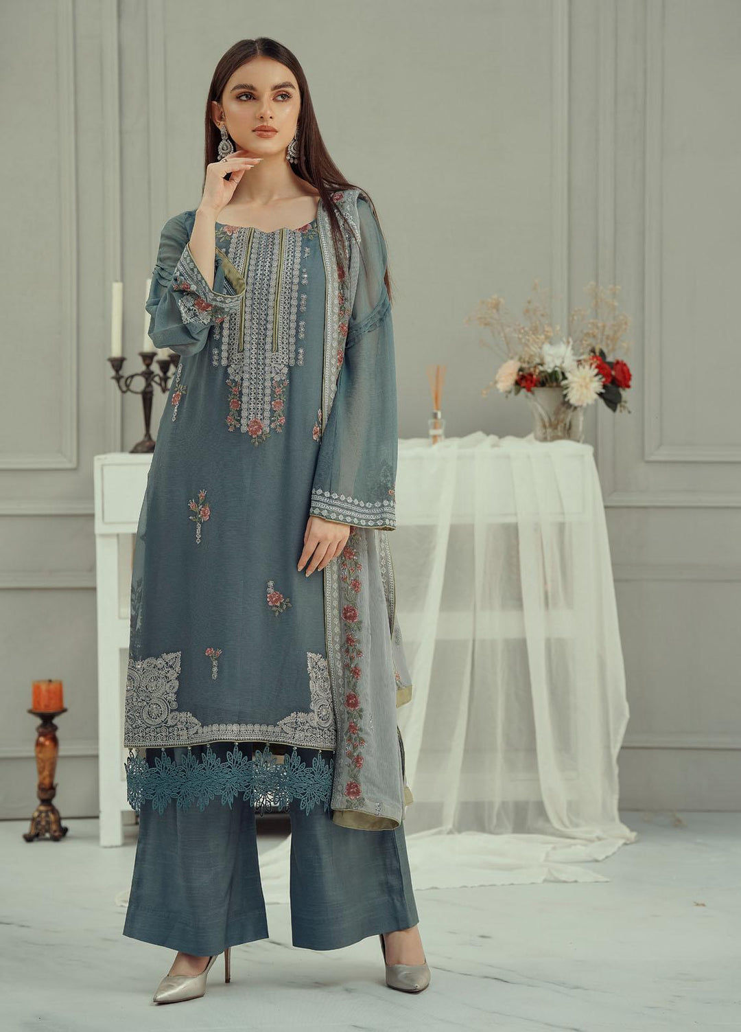 Iberis - a masterpiece of elegance and beauty. Iberis is one the most beautiful outfits from the Fascino La Flora collection. It's an embroidered 3-pc chiffon suit coming in a contrasting pastel blue shade. Having a light blue fully embroidered chiffon bottom open shirt and raw silk trouser paired with a dark blue shaded embroidered organza dupatta.