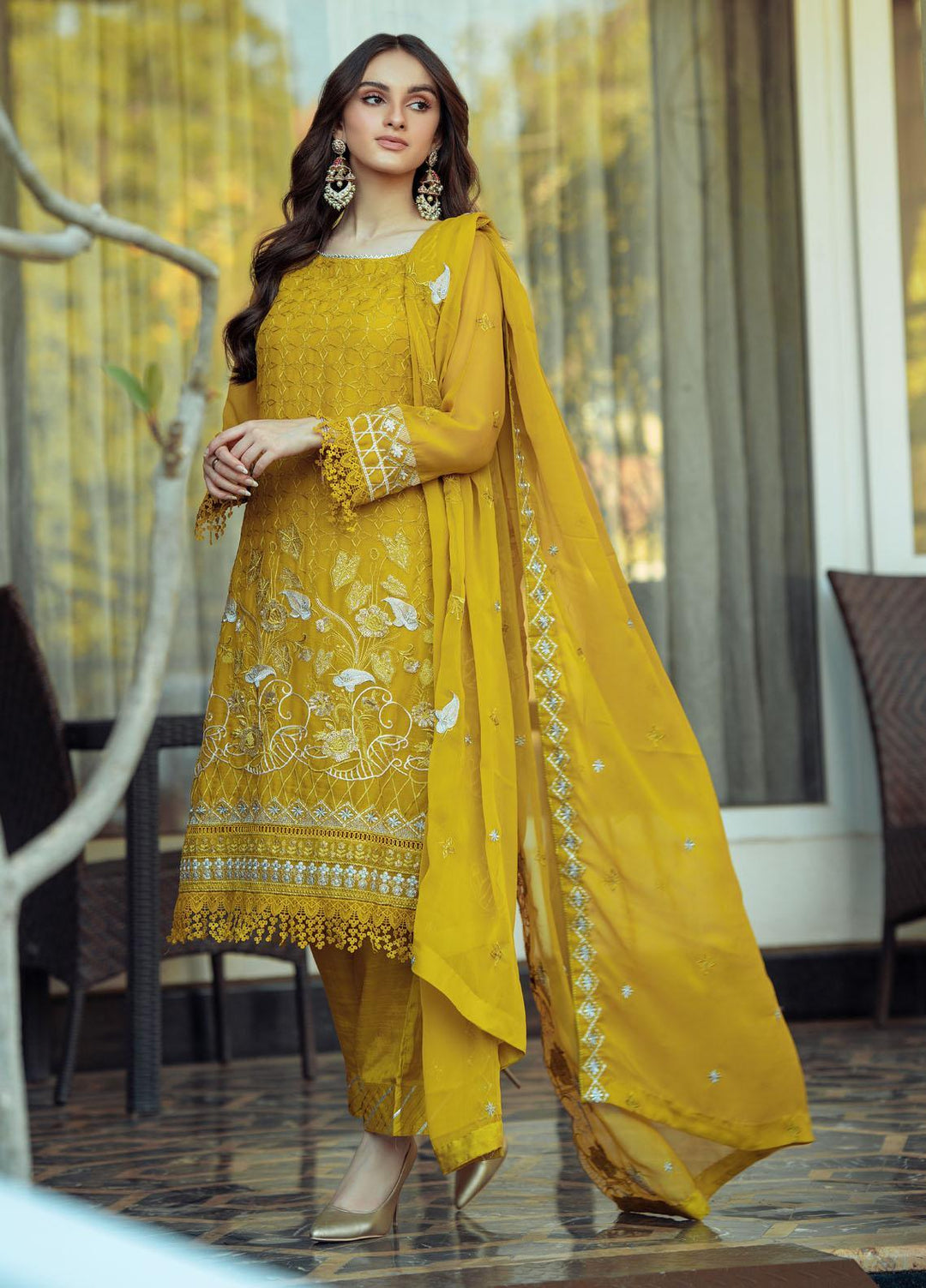 Sunny - a yellow pastel shaded 3 piece embroidered chiffon suit having a embroidered front and a dyed chiffon back paired with a organza block print dupatta and a dyed Pakistani raw silk bottom. Most importantly the floral embroidery over the neckline and a ring on the sleeves is what makes the eye struck on this outfit.