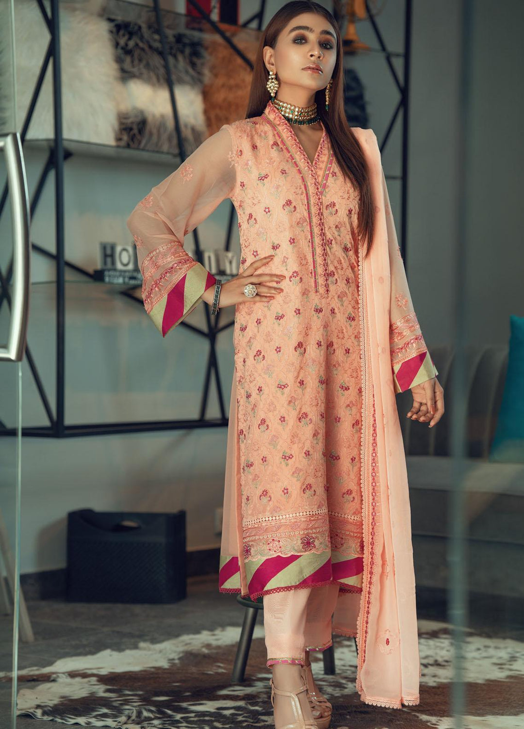 Divine - a blend of beautiful colors embroidered over the ensemble. This 3 pc unstitched chiffon suit is a sea green outfit paired with a pink organza dupatta. Having a blend of floral embroidery all over, which depicts the real floral art and gets you blooming.