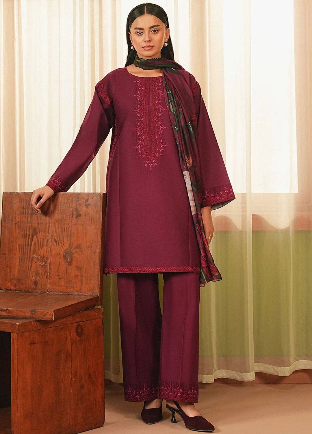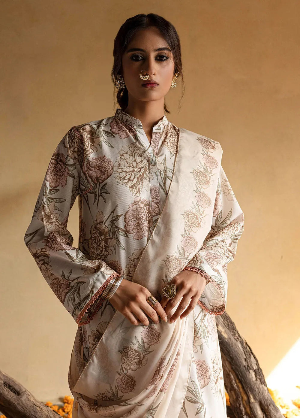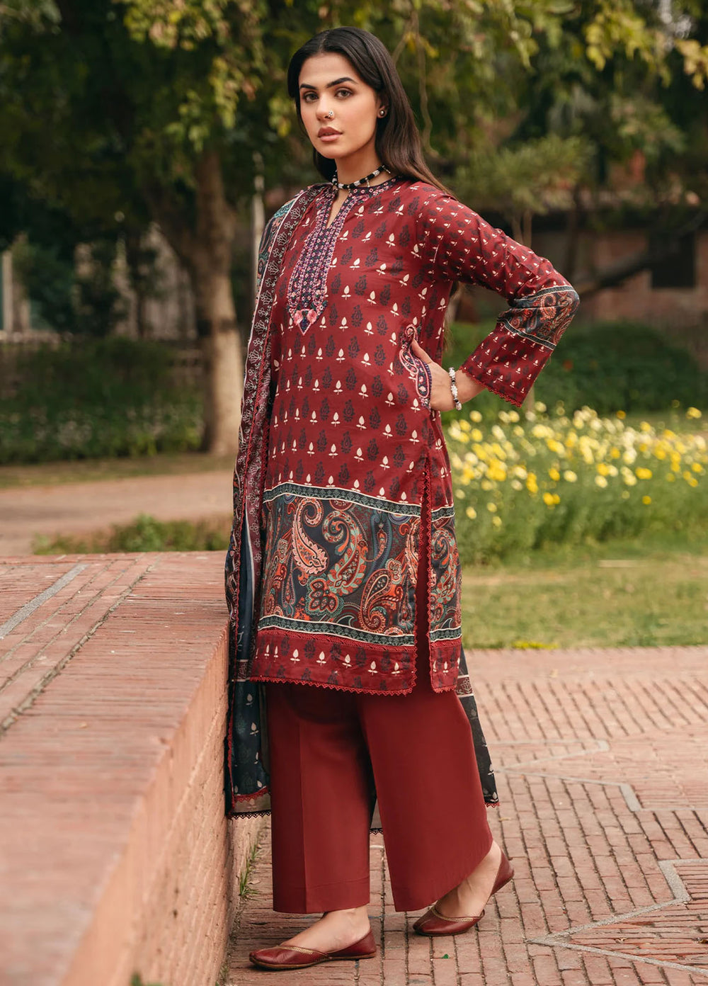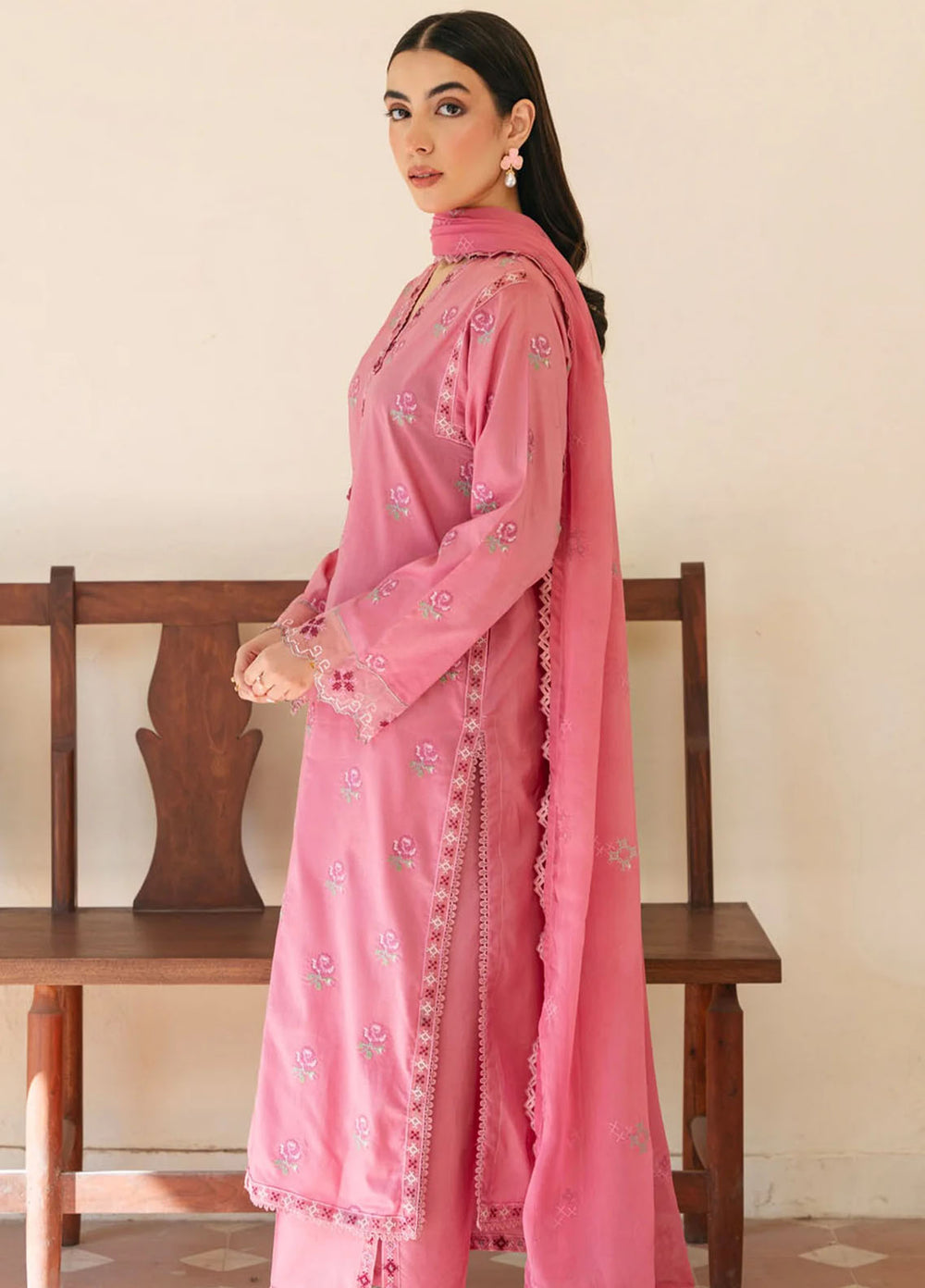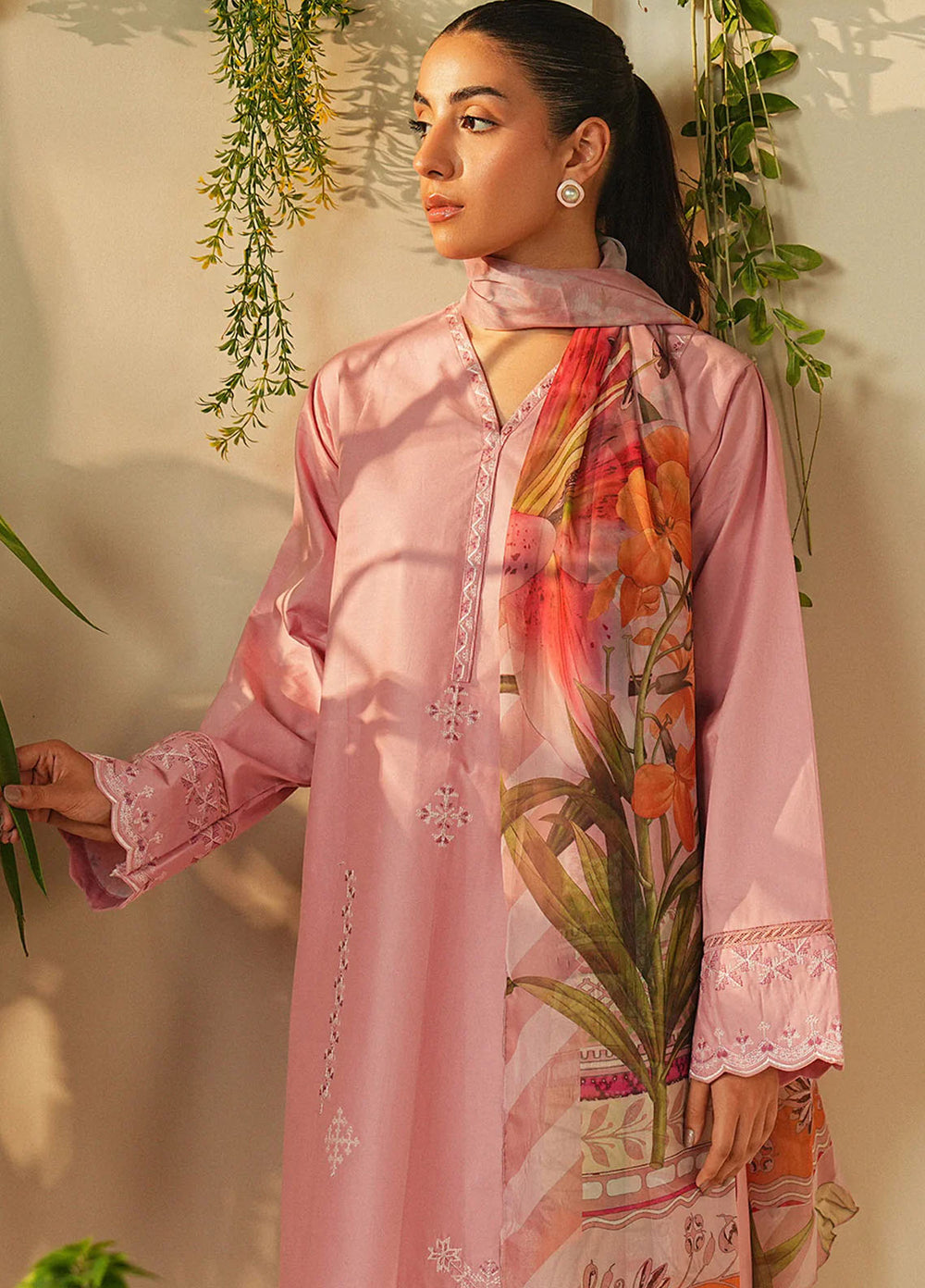 Marigold—a bright orange outfit. Made up of premium organza fabric with an embroidered front of the shirt paired with a plain shalwar and a block foil printed dupatta. The model paired it with a fawn and brown khussa, and she was looking absolutely adorable.