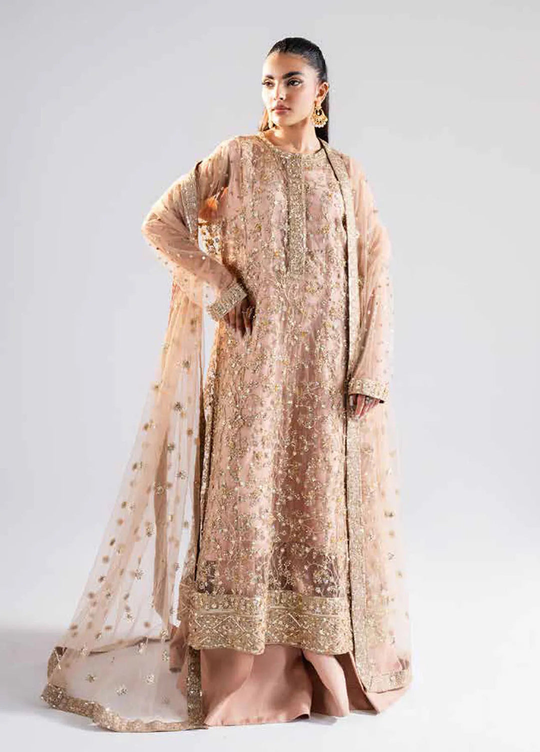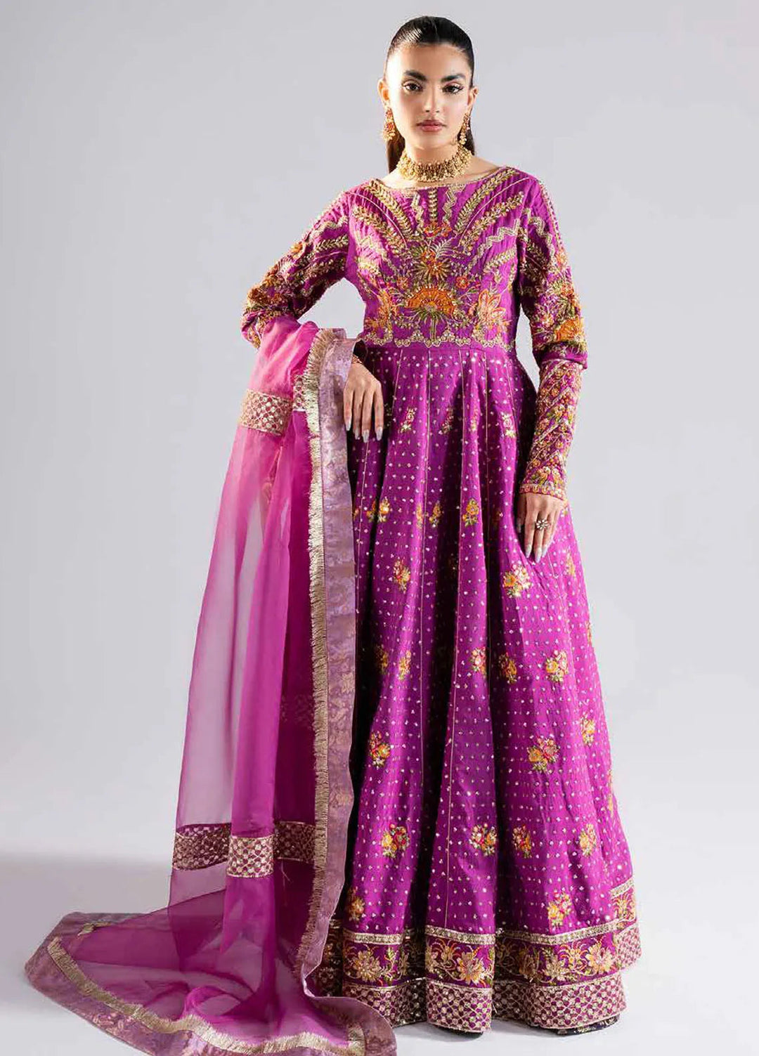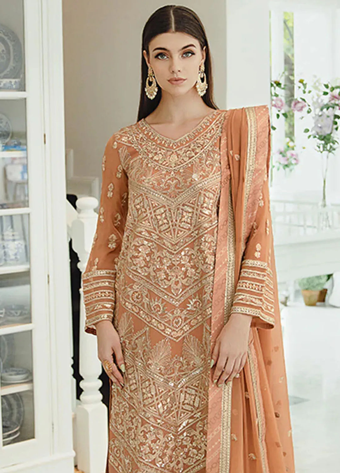 This is the ideal choice for girls to wear at their wedding and become the center of attention of the people at the event. This collection contains pure chiffon embroidered front and back, embroidered sleeves, a net lengha with embroidery over it, an embroidered chiffon dupatta, and an embroidered palu border with lining.