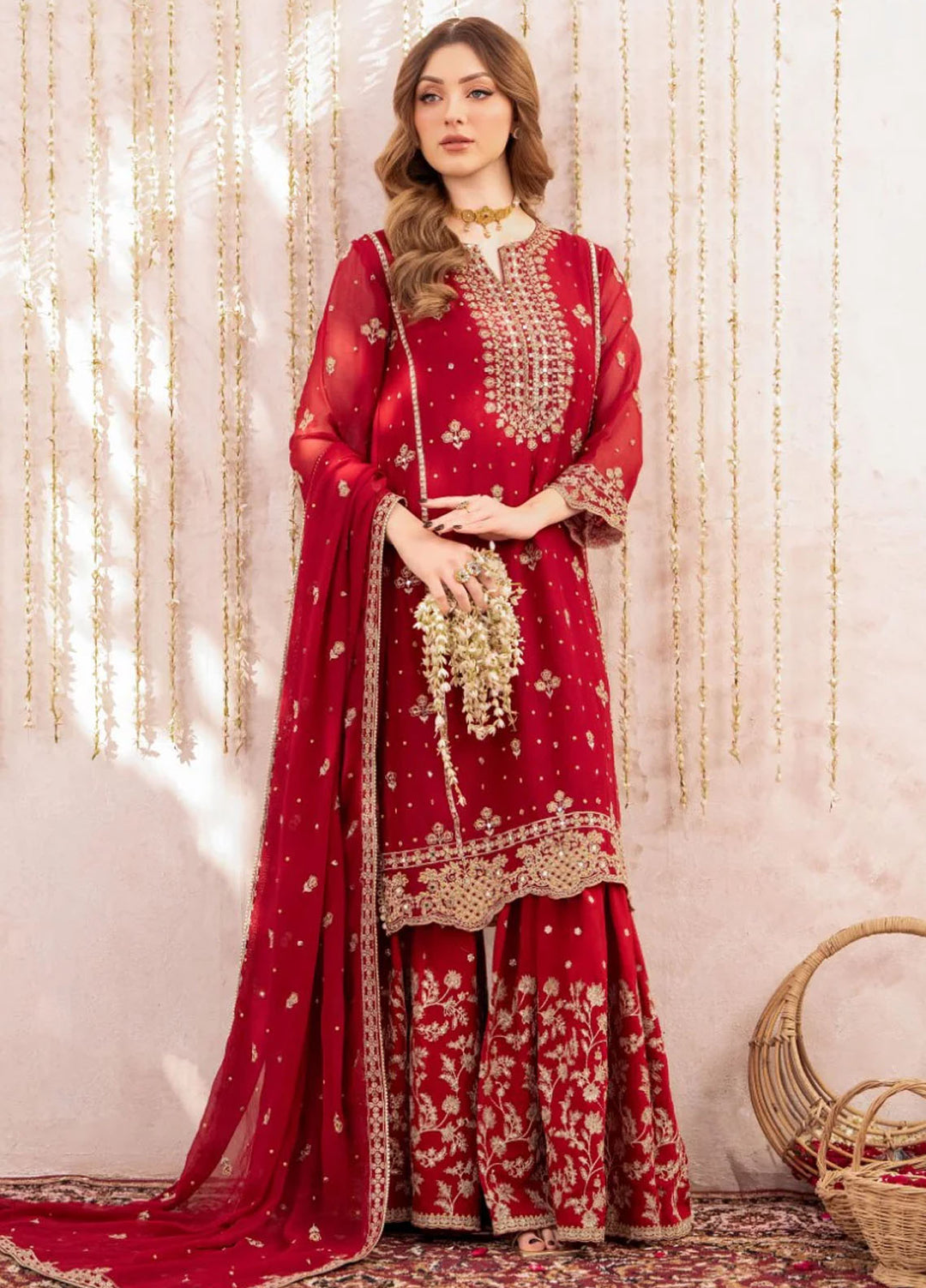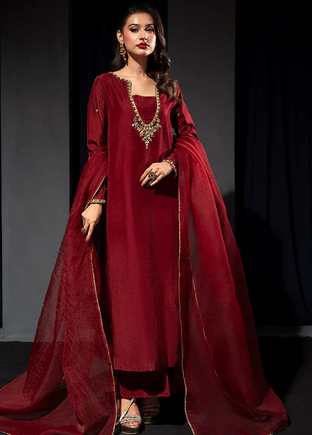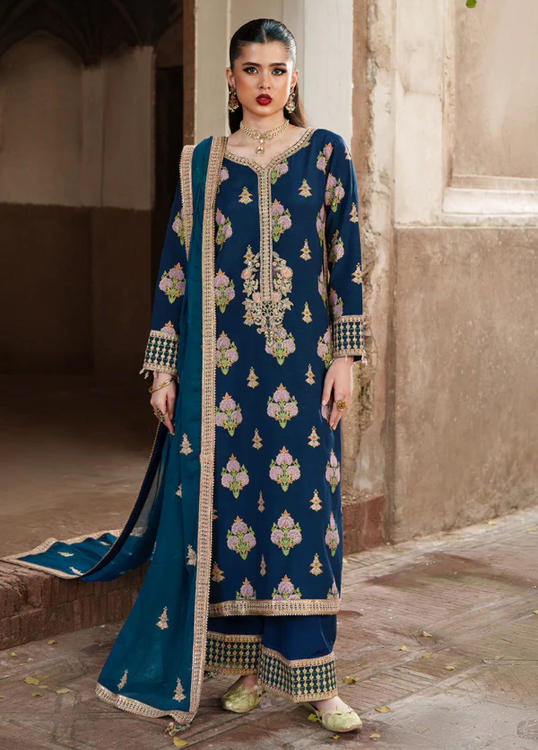Chiffon is something women love to be wrapped in. Especially the women of Pakistan, as to the reason why chiffon looks absolutely beautiful crafted in traditional ethnic fashion. Ashna luxury chiffon collection featured 4 piece unstitched dresses having hand work and rich embellishments all over giving the dress a real opulent luxurious look. The suit comes with raw silk undershirts paired with an embroidered chiffon dupatta and a cotton silk trouser. A total of six designs this collection had to offer, each being unique in its artwork and color palette.